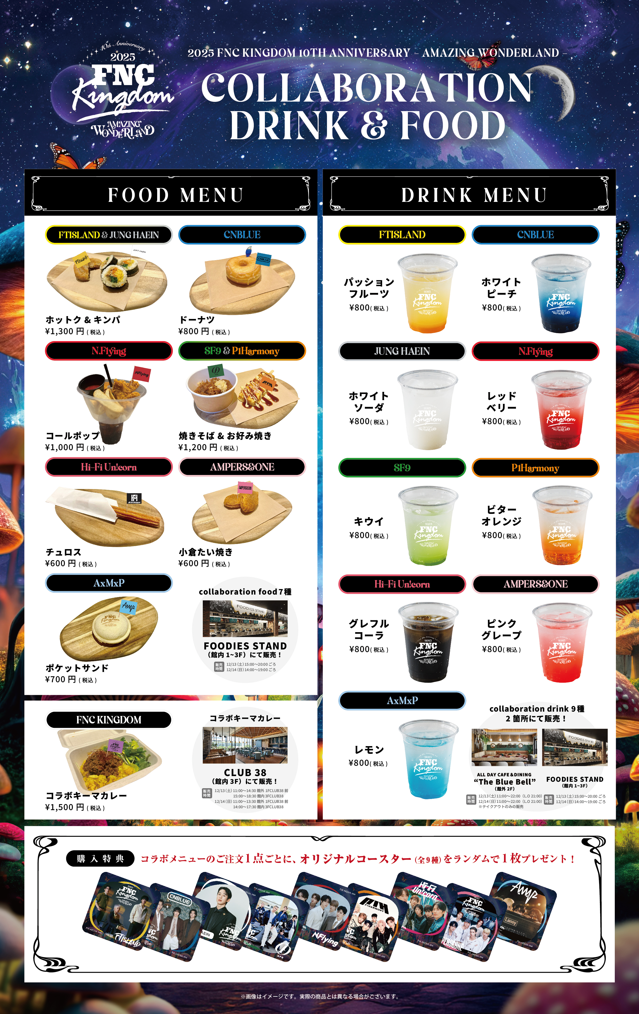 ついに12/13(土)より開催の、「2025 FNC KINGDOM 10TH ANNIVERSARY – AMAZING WONDERLAND -」が開催!開催を記念して、会場でのコラボドリンク&フードの販売が決定いたしました!
