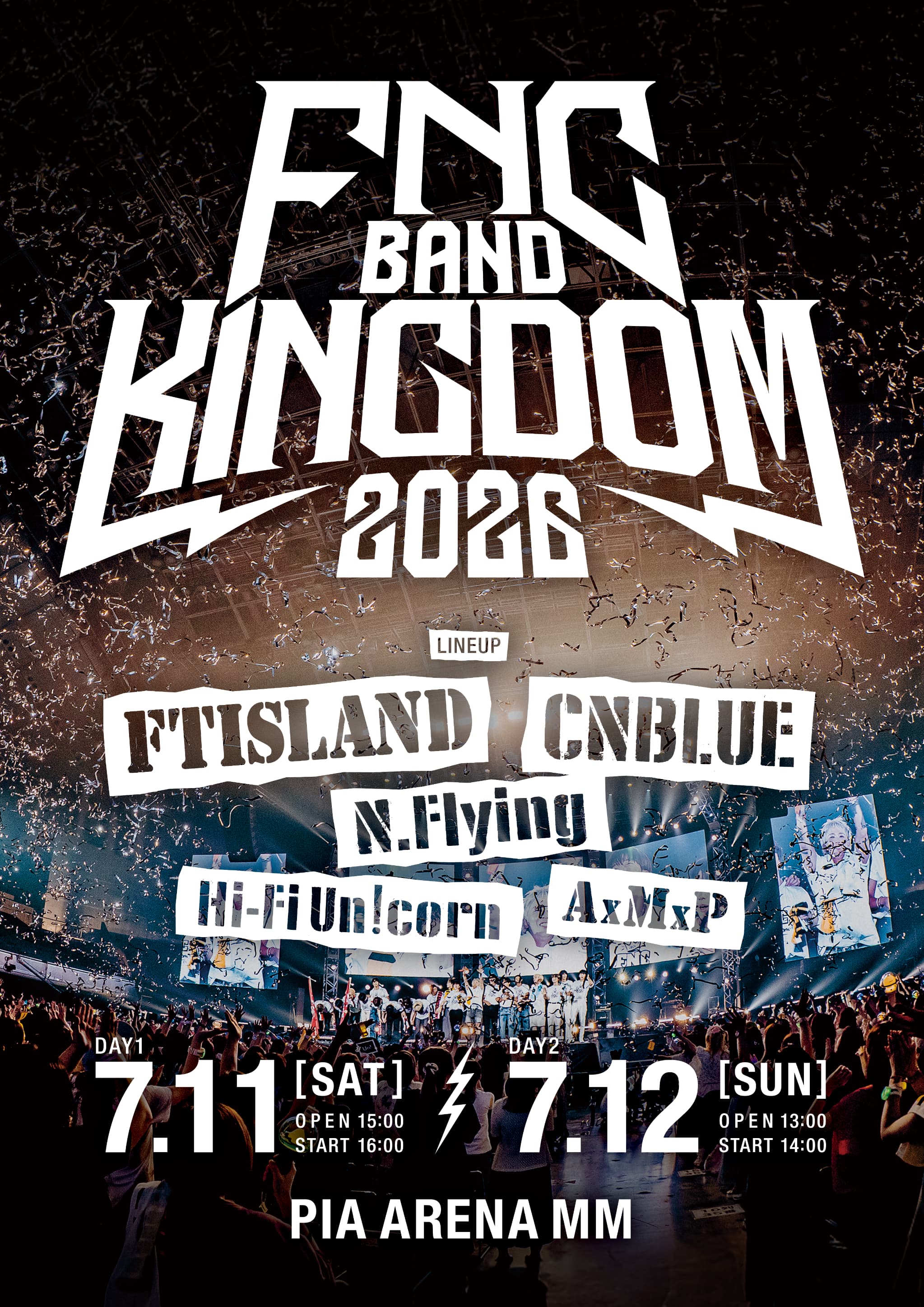 FNC ENTERTAINMENT所属のバンドグループが総出演する、夏のバンドフェス「FNC BAND KINGDOM 2026」が、7月11日(土)、12日(日)の2日間に渡ってぴあアリーナMMにて開催決定!